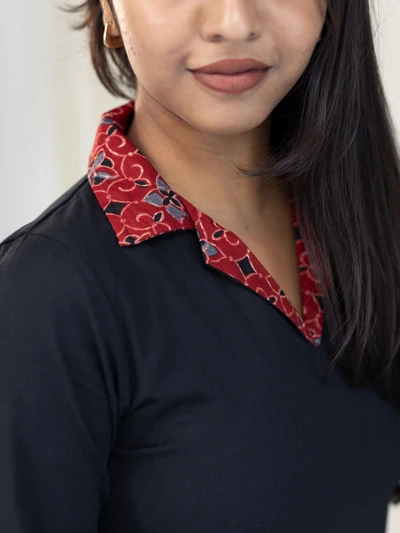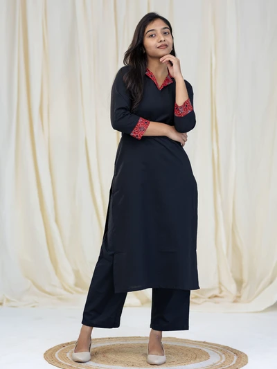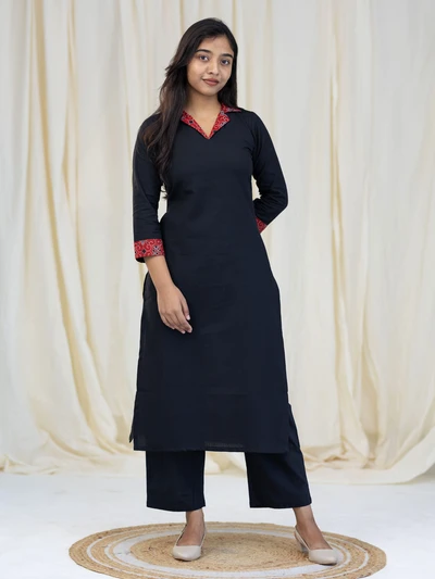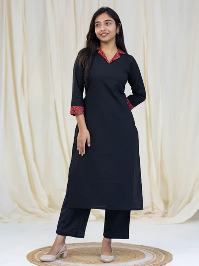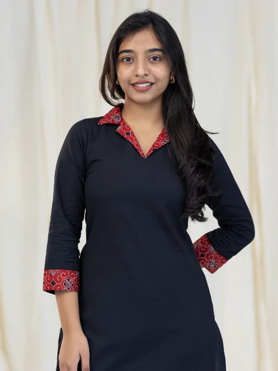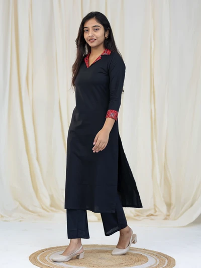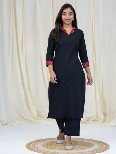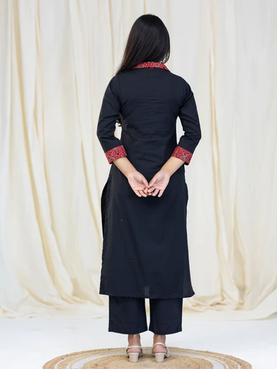 Ajrak Detailed Solid Black Kurta