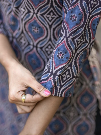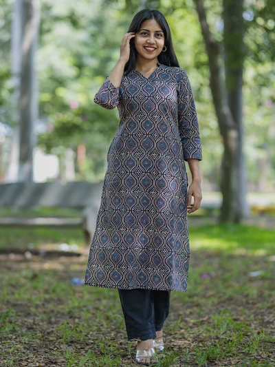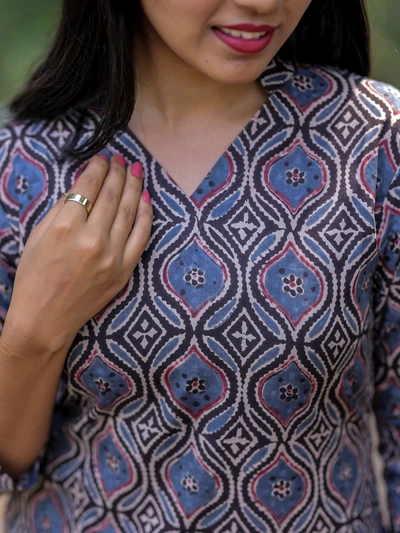 Blue Ajrak Floral Printed Kurta