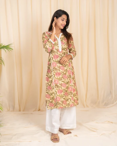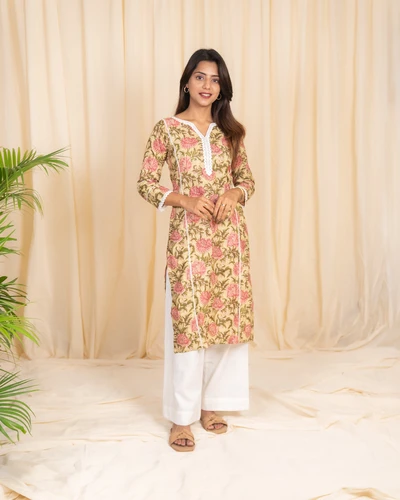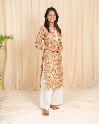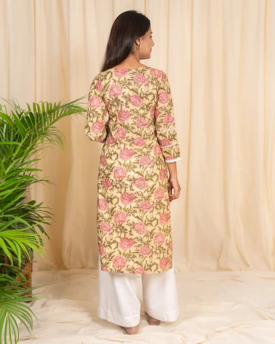 Cotton Golden Beige Floral Printed Kurta