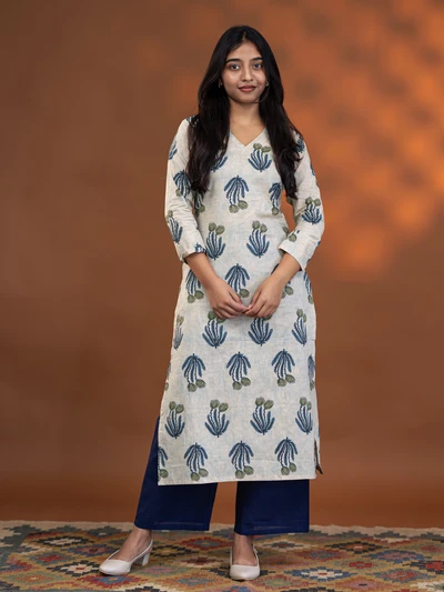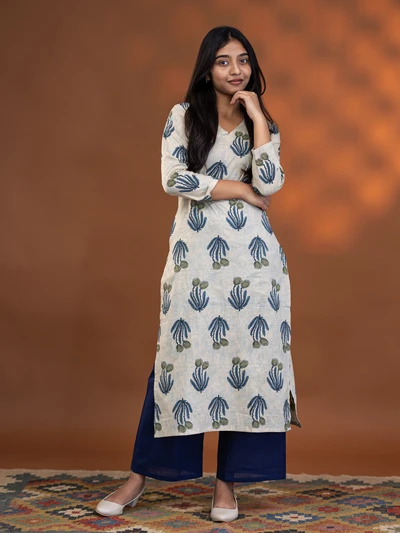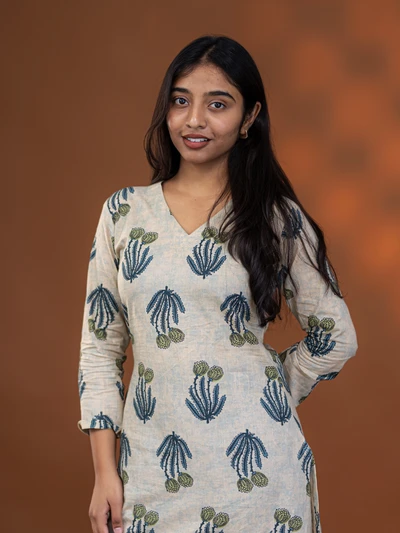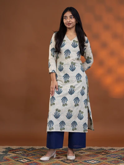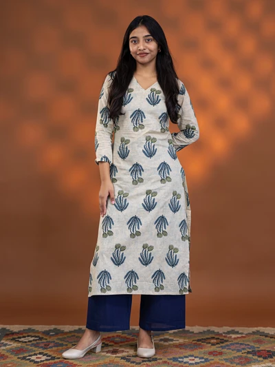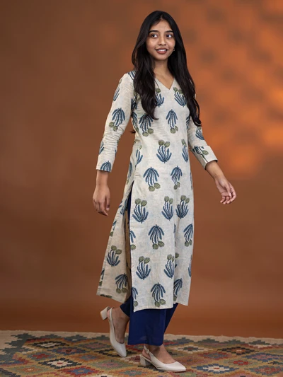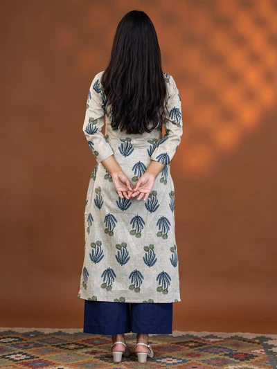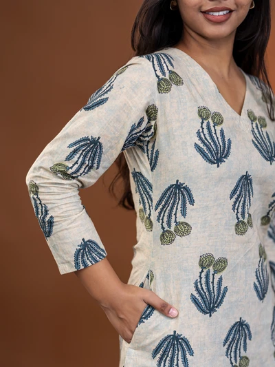 Cream Aqua Floral Block Kurta