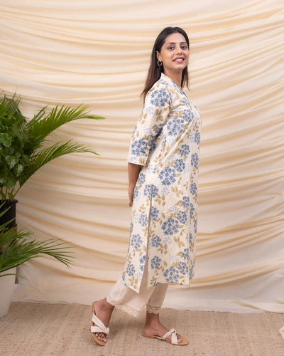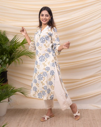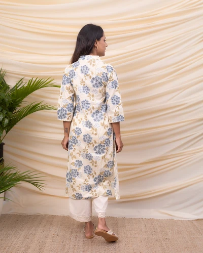 Cream Blue Primrose Cotton Kurta