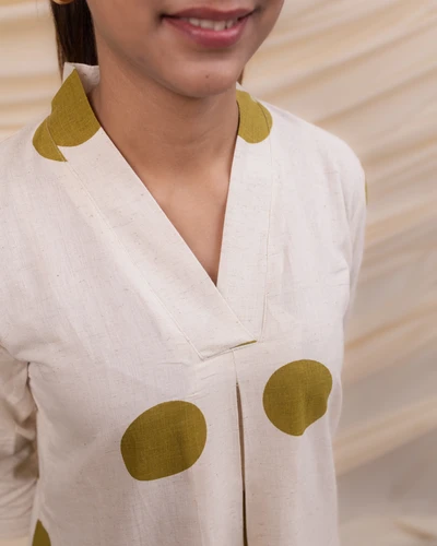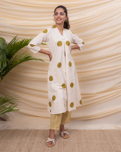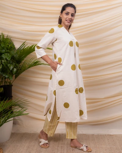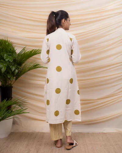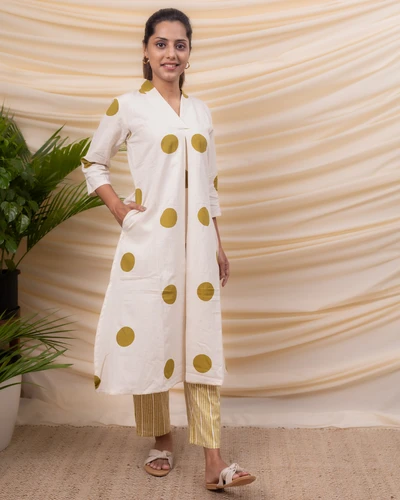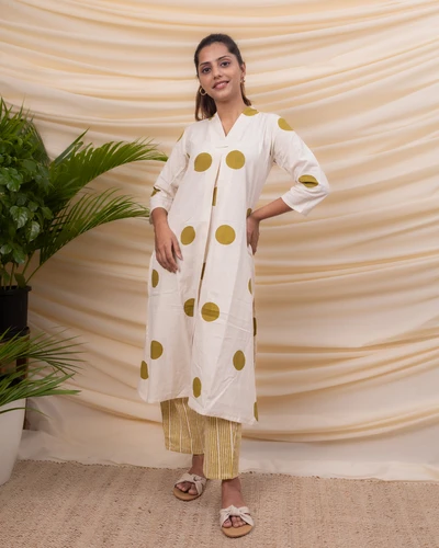 Green Polka Cotton Kurta with Striped Trousers