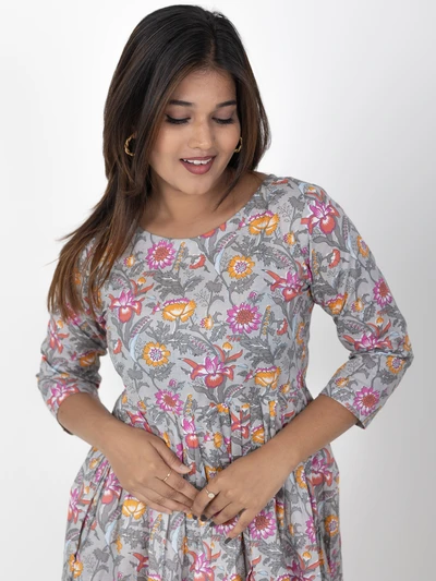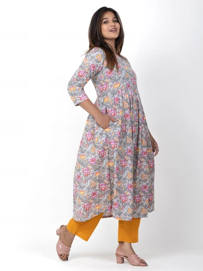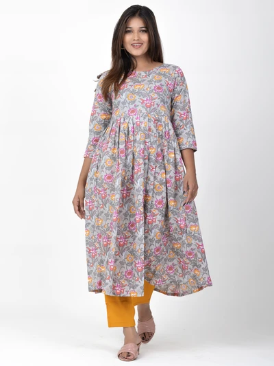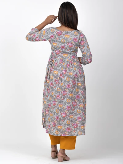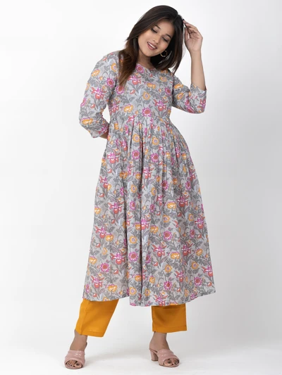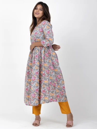 Grey Floral A-line Anarkali Kurta with Trousers
