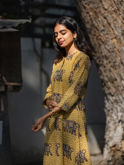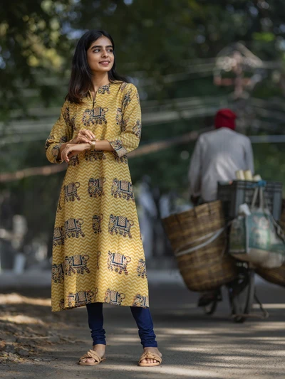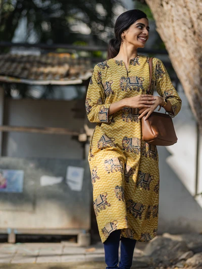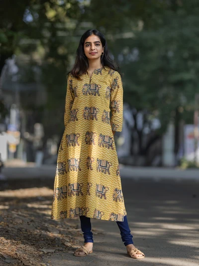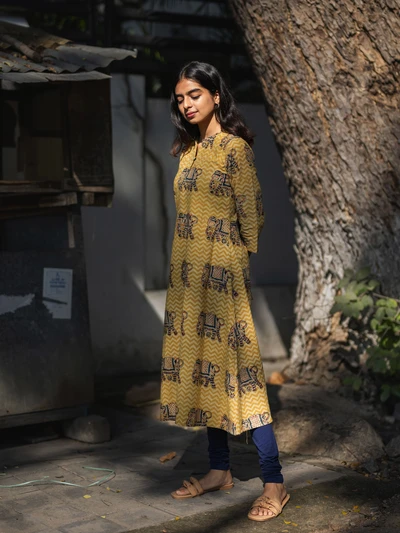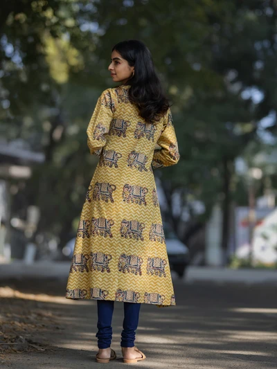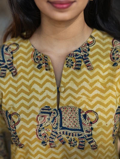 Handblock Yellow Elephant Kalamkari Kurta