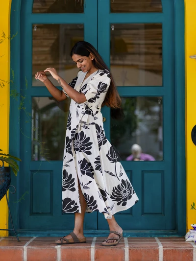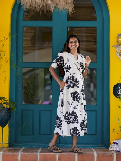 Monochrome Floral Printed Wrap Dress