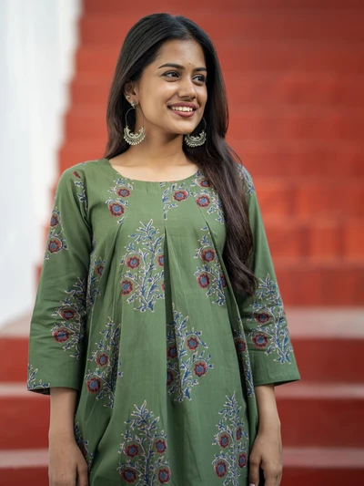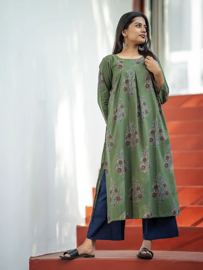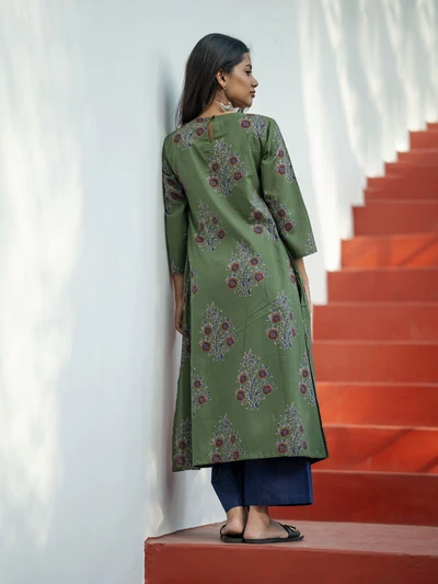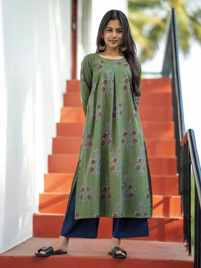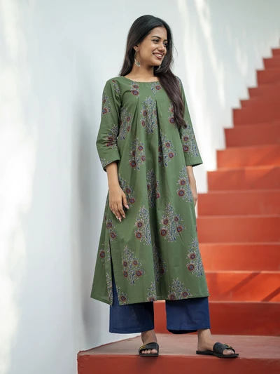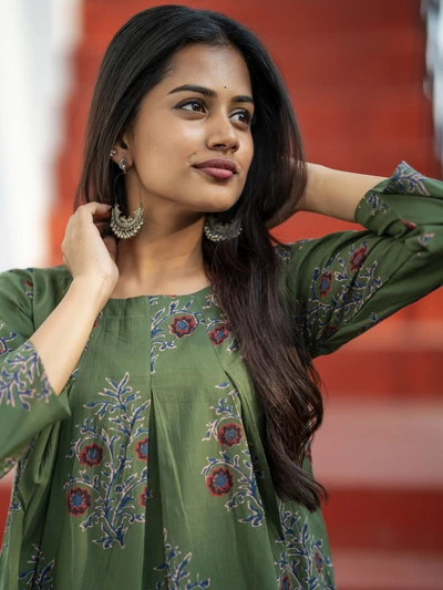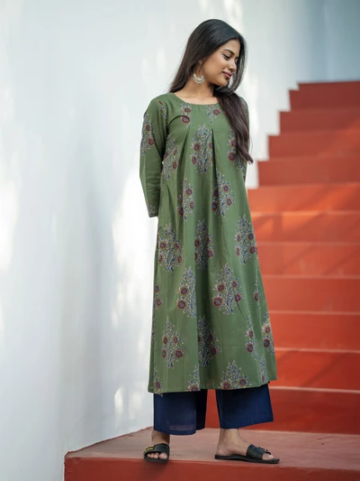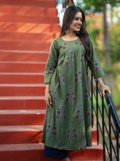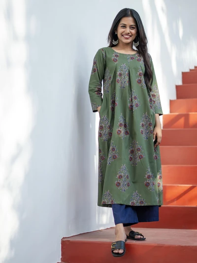 Olive Green Ajrak Floral Printed Kurta