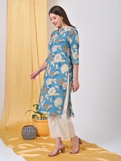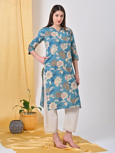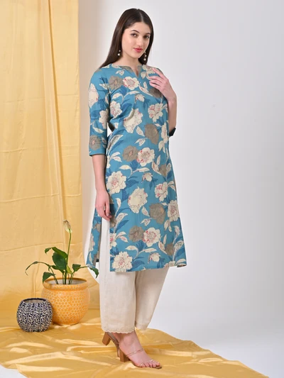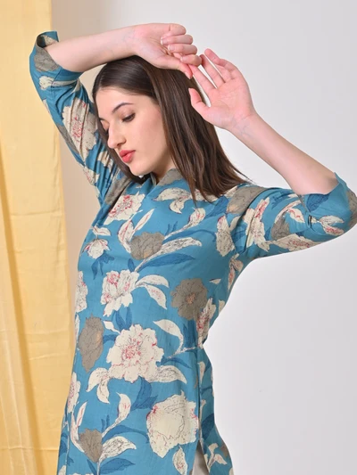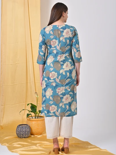 Teal Floral Cotton Kurta