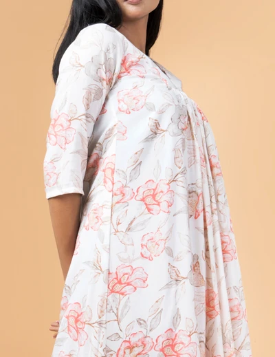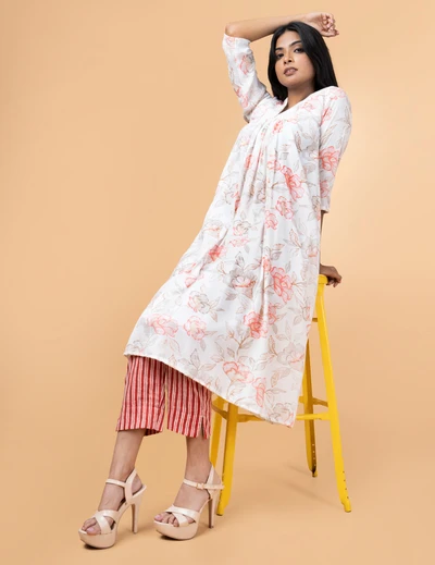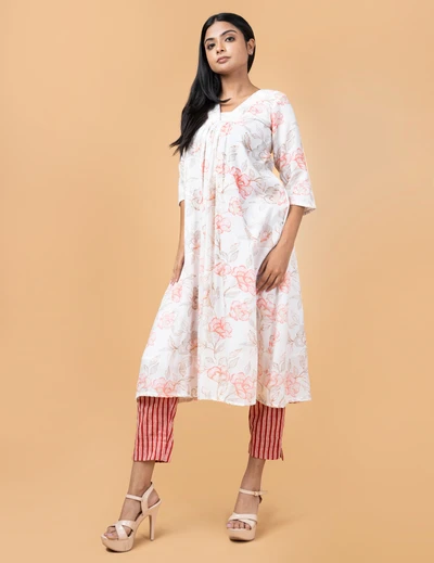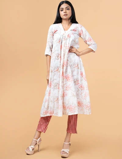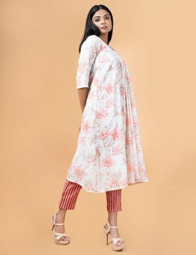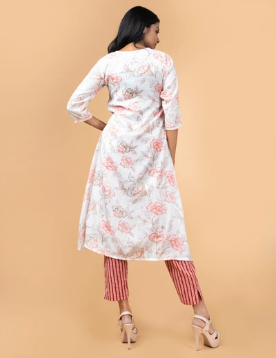 White Floral Kurta with Striped Trousers