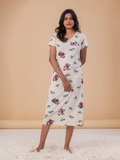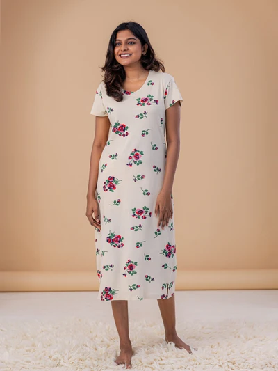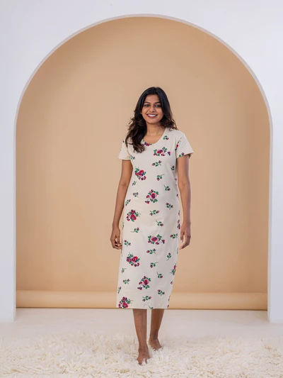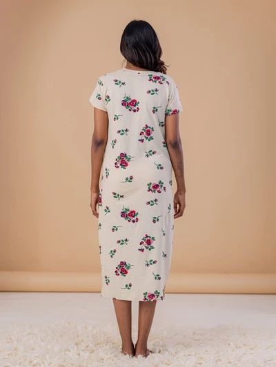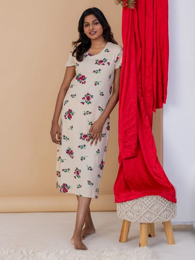 Cream Leafy Leaf - Cotton Maternity Lounge Dress