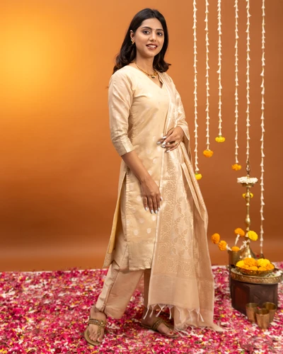 Golden Beige Banaras Suit Set with Dupatta