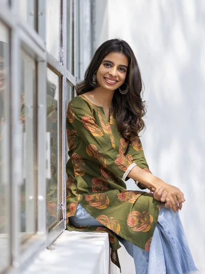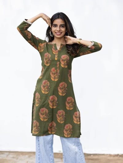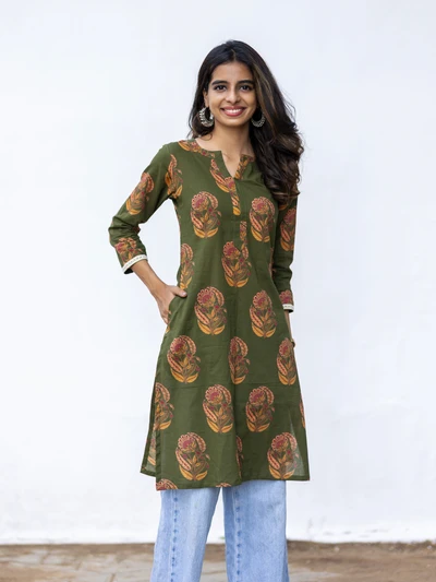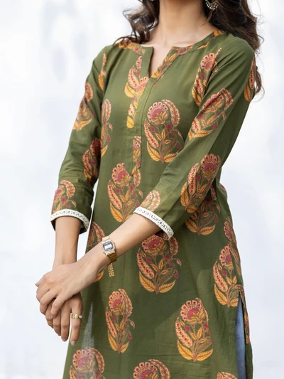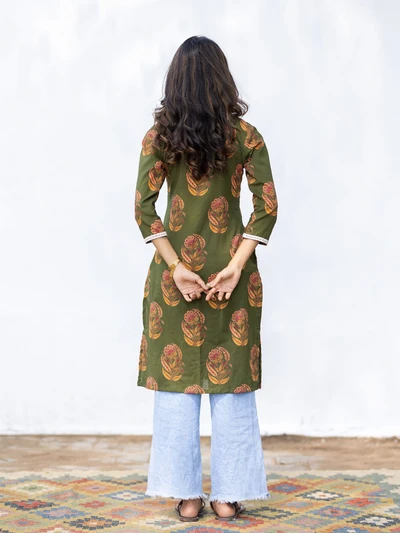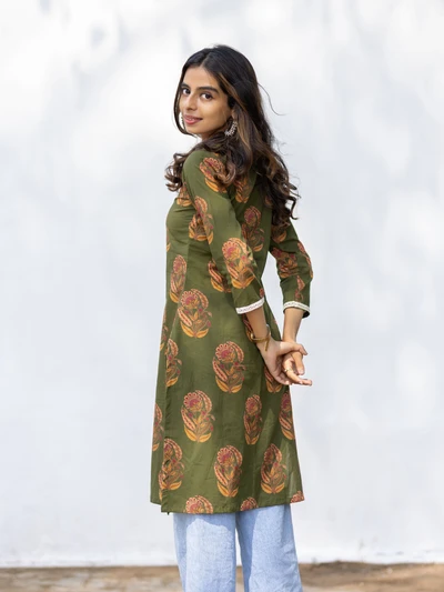 Green Floral Block Cotton Kurta