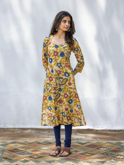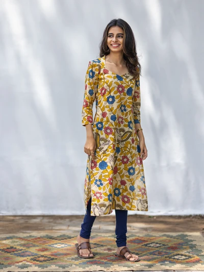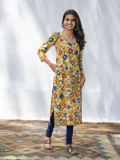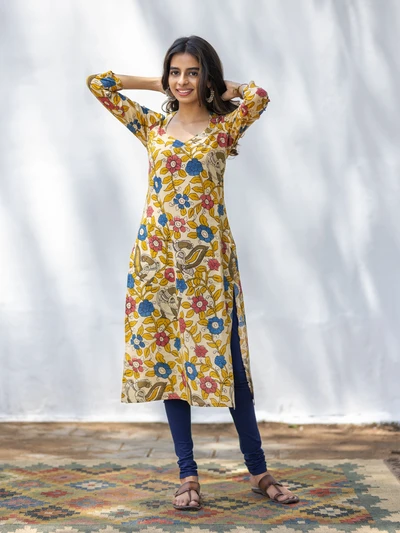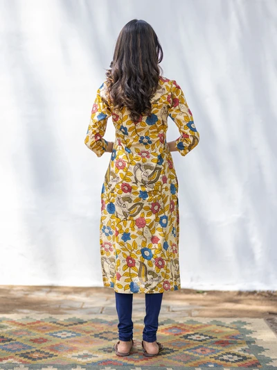 Lime Yellow Pen Kalamkari Kurta