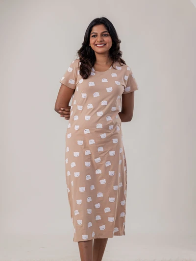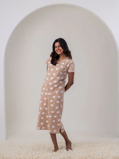 Cream Leafy Leaf - Cotton Maternity Lounge Dress